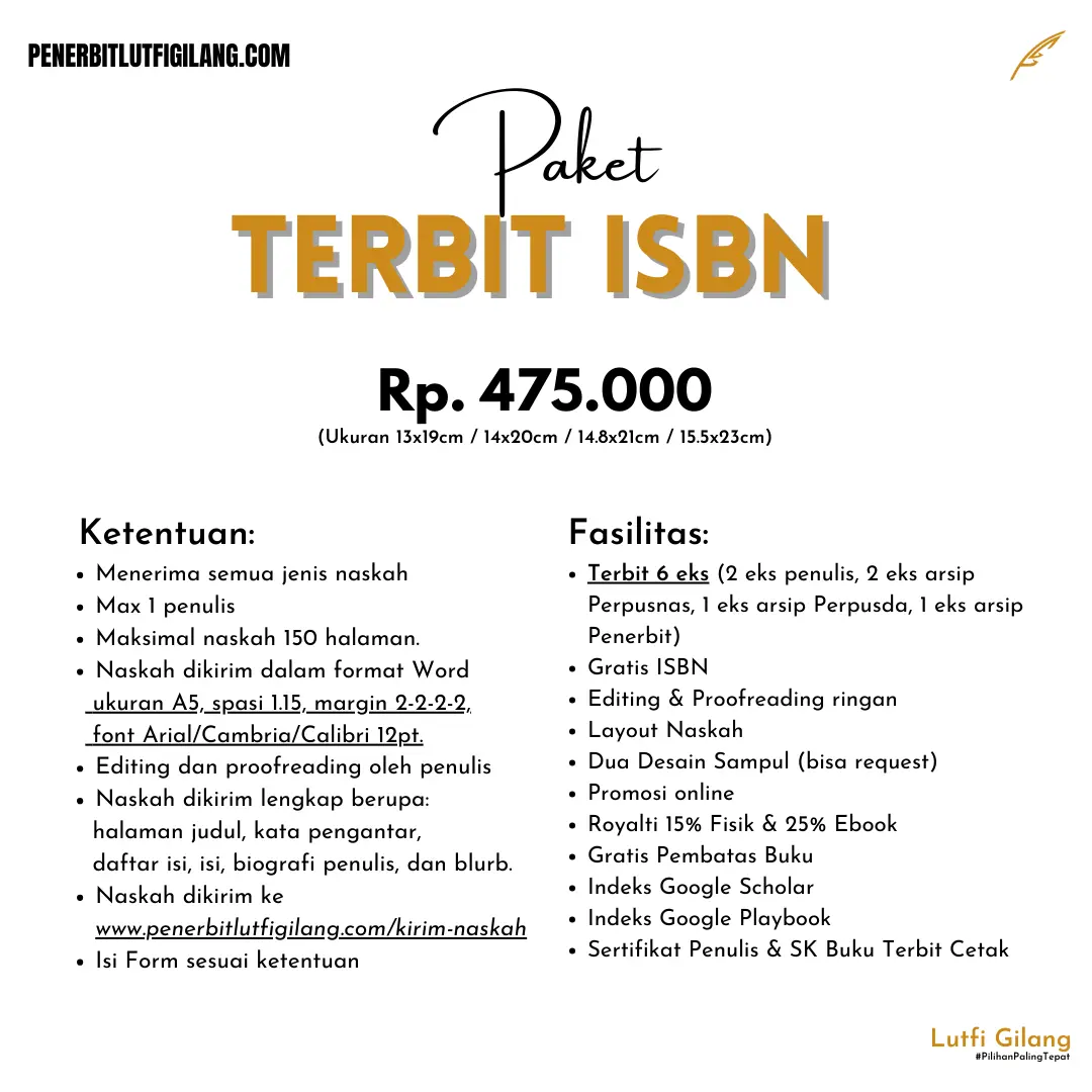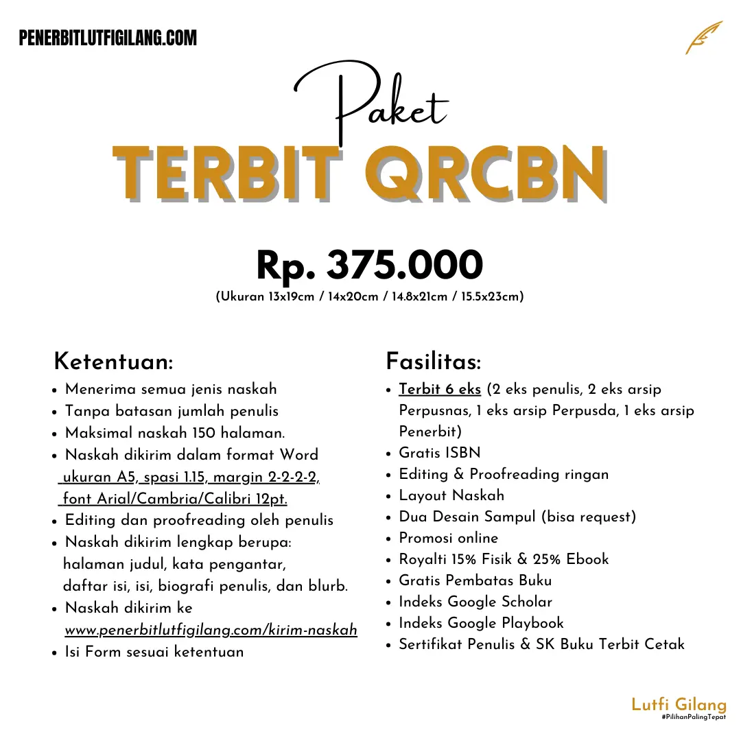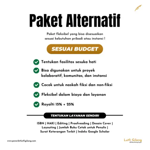 Penerbit Lutfi Gilang menghadirkan Paket Penerbitan Gratis 100% untuk komunitas, tanpa syarat apa pun dan tanpa minimal cetak. Ini adalah kesempatan bagi komunitas Anda untuk menerbitkan buku tanpa biaya, dengan hasil yang tetap berkualitas tinggi.